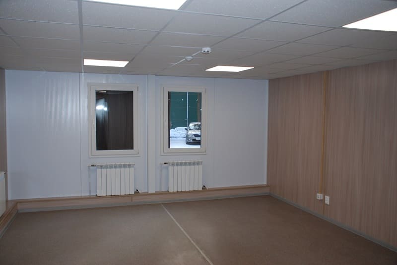 Модули имеют утепление 150 мм и высоту потолков 2300 мм. Каждый модуль оборудован электроконвектором, светильниками и розетками.